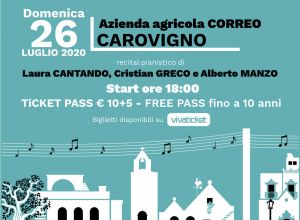Vi ricordiamo l’appuntamento musicale del 26 luglio 2020 presso l’Azienda Agricola Correo a Carovigno con il recital pianistico di Laura Cantando, Cristina Greco e Alberto Manzo