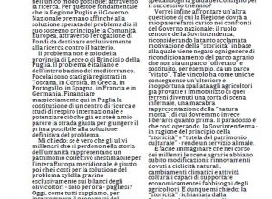Trovo fortemente astruso, e probabilmente illegittimo, l’accanimento nei confronti degli agricoltori a cui viene imposto l’obbligo di reimpiantare nuovi ulivi, avendo la certezza della presenza di un batterio micidiale, e non poter decidere autonomamente di destinare i propri terreni alla coltivazione di altre piante.