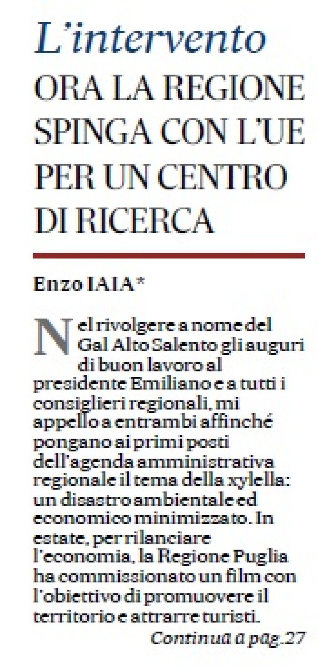 Nel rivolgere a nome del Gal Alto Salento gli auguri di buon lavoro al presidente Emiliano e a tutti i consiglieri regionali, mi appello a entrambi affinché pongano ai primi posti dell’agenda amministrativa regionale il tema della Xylella: un disastro ambientale ed economico minimizzato. In estate, per rilanciare l’economia, la Regione Puglia ha commissionato un film con l’obiettivo di promuovere il territorio e attrarre turisti.