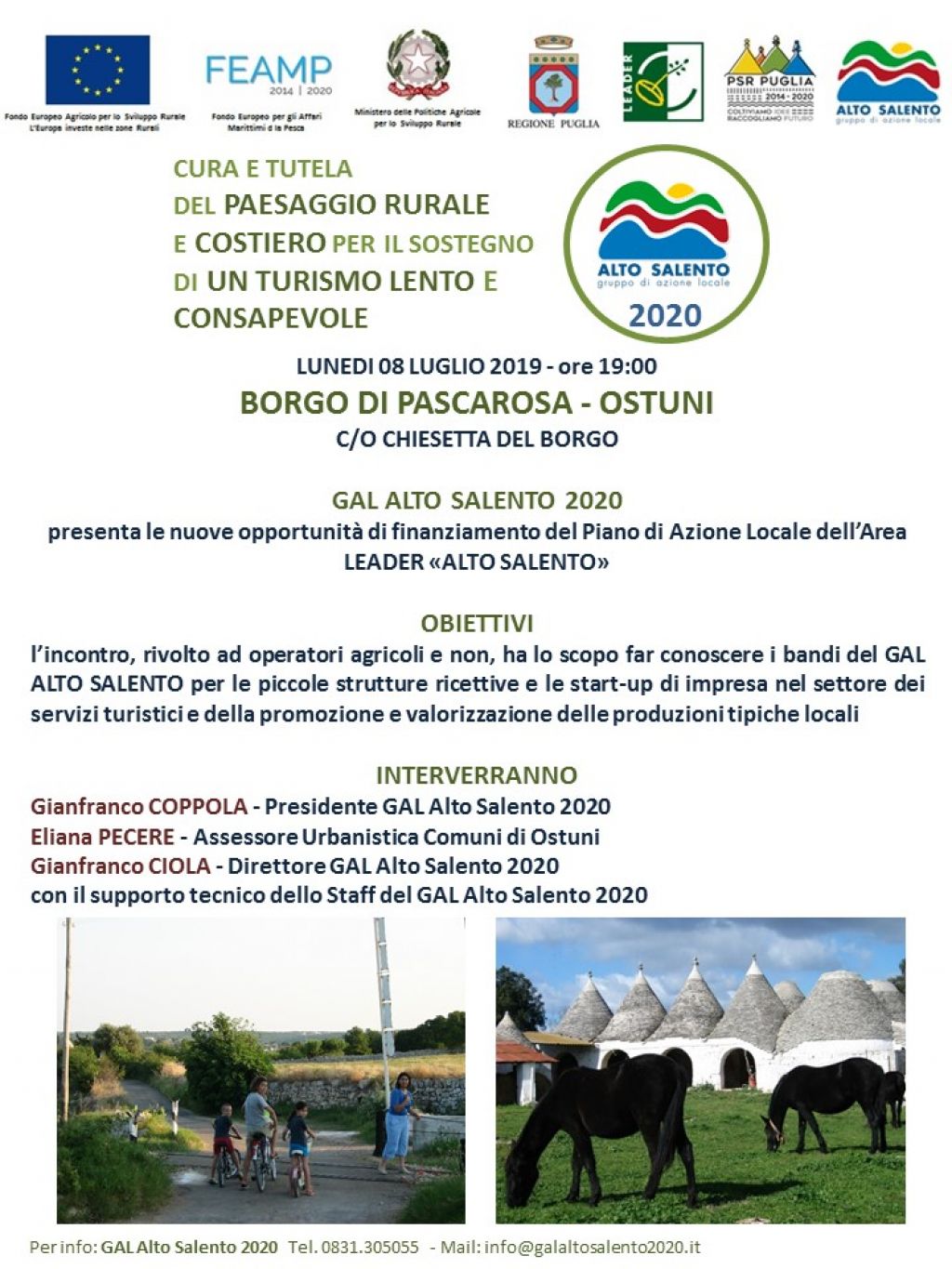 Lunedì 08 luglio alle ore 19,00 nella borgata di Pascarosa (Ostuni) nei pressi della chiesetta del borgo con l’assessore all’Urbanistica di Ostuni, Eliana PECERE, e mercoledì 17 Giugno alle ore 20,00 a Tuturano (Brindisi) nella piazza del centro cittadino e con la collaborazione di Michele CAPPELLARI - Azienda Agricola “Boer il contadino”, ci confronteremo con le comunità, gli attori dei servizi turistici e semplici cittadini con l’obiettivo di raccogliere le idee e avviare percorsi virtuosi su nuove comunità di accoglienza per i turisti desiderosi di vivere il ns territorio, l’Alto Salento.