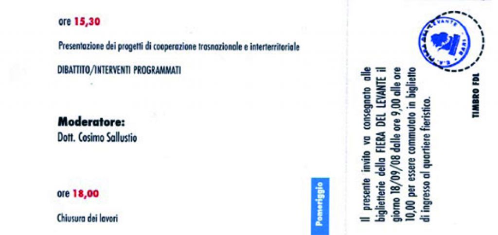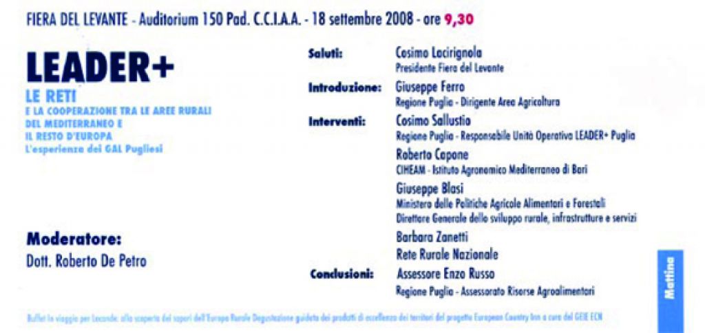 Interventi: Cosimo Sallustio - Responsabile Unita' operativa LEADER+ Puglia; Roberto Capone - CIHEAM Istituto Agronomico Mediterraneo di Bari; Giuseppe Blasi - Ministero Politiche Agricole e Forestali Direzione Generale dello Sviluppo rurale; Barbara Zanetti - Rete Rurale Nazionale.