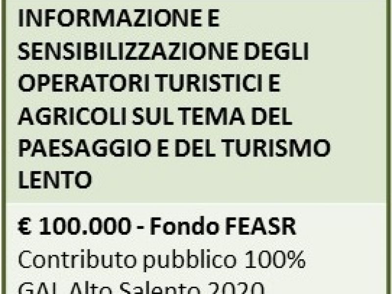 Informare e sensibilizzare gli operatori agricoli, agrituristici e turistici sulle opportunità derivanti dalla tutela del paesaggio e sui vantaggi dell'adozione di buone pratiche nella predisposizione di servizi per la mobilità lenta, attraverso l'organizzare di incontri (seminari, giornate studio sull'offerta turistica sostenibile, sull'accoglienza e sui servizi per la fruizione delle risorse ambientali, culturali, ecc) volti a consolidare rapporti di partenariato e a definire nuove offerte turistiche in linea con le valenze paesaggistiche dell’Alto Salento