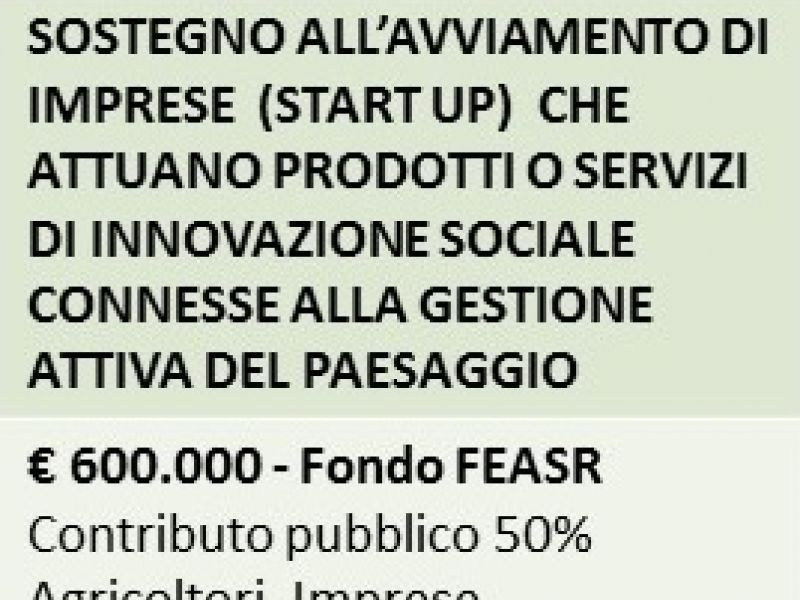 Sostegno economico (premio) alla costituzione e avvio di una start up con attività rivolte alla risoluzione di bisogni sociali espressi dalla comunità locale, dalla didattica ed educazione, ai servizi per la persona, all’agricoltura sociale, alla gestione del verde pubblico, a sviluppare prodotti e servizi per la conversione ecocompatibile del territorio e la tutela del paesaggio